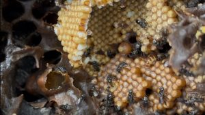 Gambar 1. Struktur sarang lebah kelulut (stingless bee) menunjukkan brood cells tempat pertumbuhan larva serta pot honey dari campuran lilin dan resin (cerumen). Sumber: dokumentasi pribadi (2025)